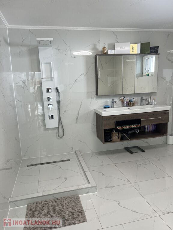 Közel a Tófürdőhöz modern, elegáns családi ház rendezett udvarral eladó. Az ingatlan földszinti részén tágas nappali, konyha-étkező, szoba, fürdőszoba, háztartási helyiség, míg az emeleti részen kettő szoba, gardrób, háztartási helyiség / konyha kialakítására is alkalmas /, fürdőszoba kapott helyet. A fűtés gáz cirkó kazánnal megoldott. Világos, tágas terek jellemzik az épületet. Az emeleti részen lehetőség van egy 40 m2 apartman, vagy hobbyszoba kialakítására is. A parkolás két gépkocsi részére fedett beállóban lehetséges.